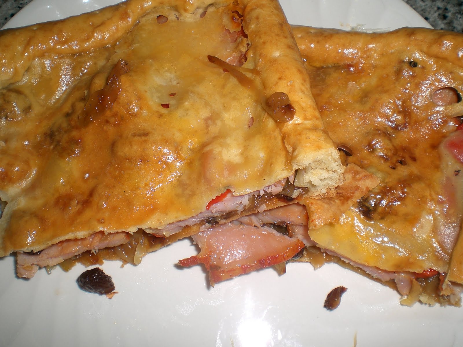 carne o pescado al gusto (bacalao desalado y en trozos pequeños, pollo, lomo de cerdo, conejo, sardinas, atun, etc. Es importante que la carne del relleno vaya cortada en trozos pequeños, de tamaño de un bocado, o menos, y sin huesos o espinas. Las carnes deben ir salteadas previamente: pasadas por aceite de manera que los jugos vayan sellados; para los pescados no es necesaria preparación previa)